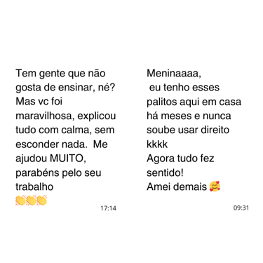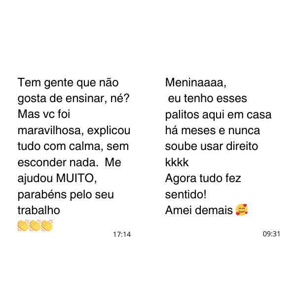 Essa é uma das partes mais importantes do seu processo: acessar as aulas práticas onde você aprende, com clareza e rapidez, como usar cada palito corretamente.